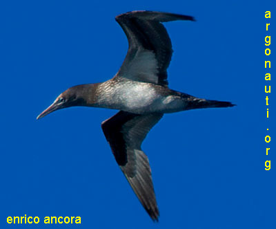 In volo la Sula alterna brevi planate, di solito basse sull'acqua, a veloci e morbidi colpi d'ala, spesso puntando il becco verso il basso.